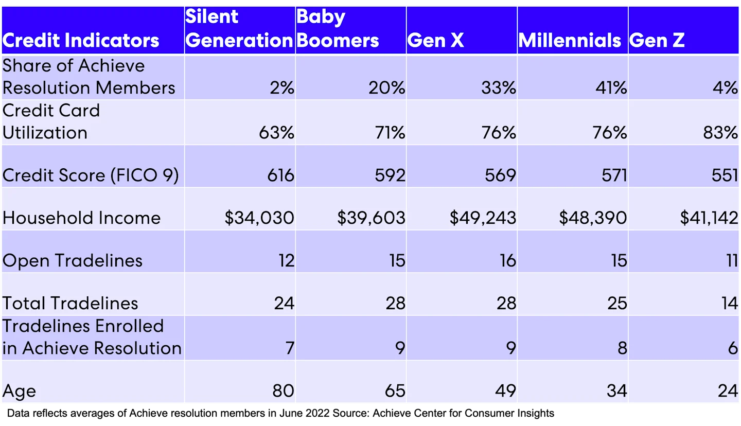The data reflected above is based on a representative sample of over 100,000 members who used Achieve debt relief, personal loan and home equity loan offerings from January 2021 to June 2022. The data and findings represents the products and services offered by Achieve and its affiliates, including Bills.com, LLC d/b/a Achieve.com (NMLS ID #138464); Freedom Financial Asset Management, LLC (NMLS ID #227977); Freedom Debt Relief (NMLS ID 1248929); and Lendage, LLC d/b/a Achieve Loans (NMLS ID #1810501).