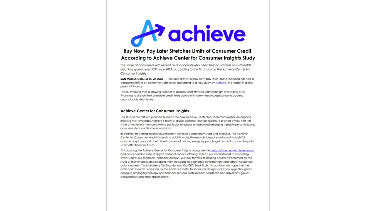 SAN MATEO, Calif., Sept. 22, 2022 — The rapid growth of buy now, pay later (BNPL) financing has had a cascading effect on consumer debt levels, according to a new study by Achieve, the leader in digital personal finance.